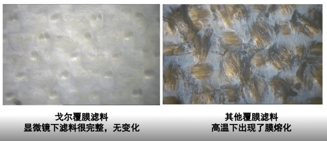 其他覆膜濾料高溫下易出現(xiàn)了膜熔化現(xiàn)象。因為膜受損,表面不再光滑,就達不到原有的清灰、攔截粉塵的效果,這種情況下粉塵極易泄露,且壓力會持續(xù)增加。