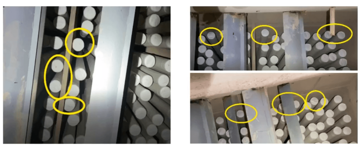 6 檢查除塵器灰斗煙氣入口處是否有堆灰現(xiàn)象。堆灰可導致截面積減小,氣流流速增大,系統(tǒng)壓差增大,并可能造成局部位置的濾袋沖刷磨損
