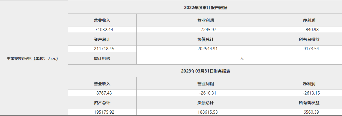 企業(yè)2023年3月31日財務報表顯示,資產(chǎn)總計195175.92萬元,負債總計188615.53萬元,所有者權益6560.39萬元,營業(yè)收入8767.43萬元,營業(yè)利潤-2612.68萬元,凈利潤-2613.15萬元。
