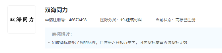 據(jù)查詢“雙海同力”品牌注冊已于2021年2月7日通過,目前在有效期內(nèi)。注冊商標申請人為西平縣瑞平水泥粉磨有限公司。