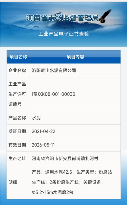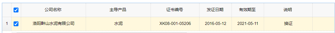 據(jù)查詢,生產(chǎn)許可證編號XK08-001-06236,對應生產(chǎn)企業(yè)為洛陽中聯(lián)水泥有限公司,該編號許可證有效期已于2021年1月12日截止。