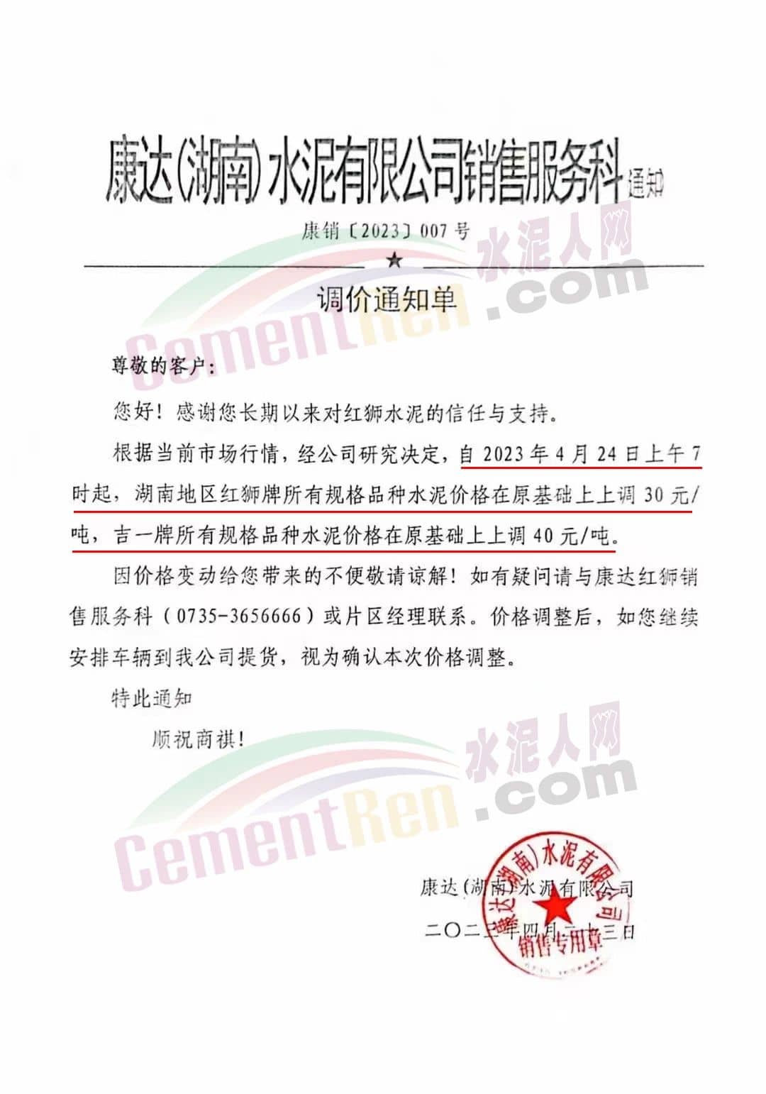 與上述區(qū)域類似,湖南區(qū)域紅獅水泥旗下康達湖水泥有限公司銷售服務(wù)科通知稱,根據(jù)當(dāng)前市場行情,經(jīng)公司研究決定,自2023年4月24日上午7時起,湖南地區(qū)紅獅牌所有規(guī)格品種水泥價格在原基礎(chǔ)上上調(diào)30元/噸,吉一牌所有規(guī)格品種水泥價格在原基礎(chǔ)上上調(diào)40元/噸。