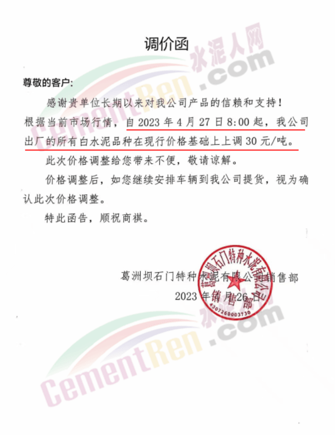 葛洲壩石門特種水泥有限公司銷售部通知,自2023年4月27日8時起,公司出廠的所有白水泥在現(xiàn)行價格基礎(chǔ)上上調(diào)30元/噸。
