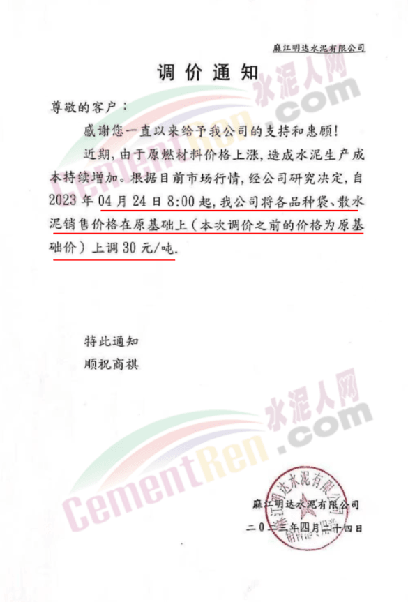 麻江明達(dá)水泥有限公司通知稱,近期由于原燃材料價格上漲,造成水泥生產(chǎn)成本持續(xù)增加。根據(jù)目前市場行情,自2023年4月24日8時起,公司將各品種袋、散水泥銷售價格在原基礎(chǔ)上上調(diào)30元/噸。