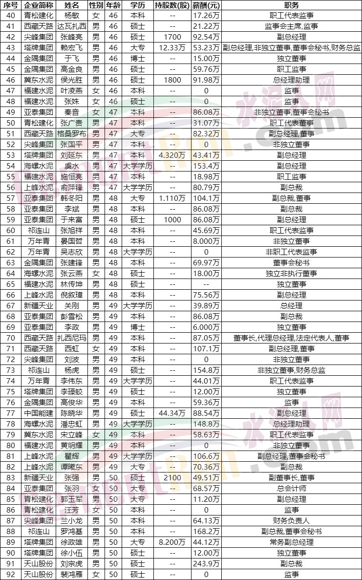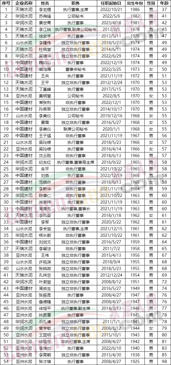 據水泥人網了解,部分水泥集團已明確年齡在58歲的高管退居二線,從上市公司公布的數據也可見出生于1970-1980年間的管理層為目前行業(yè)的主力,且多為本科及以上學歷。