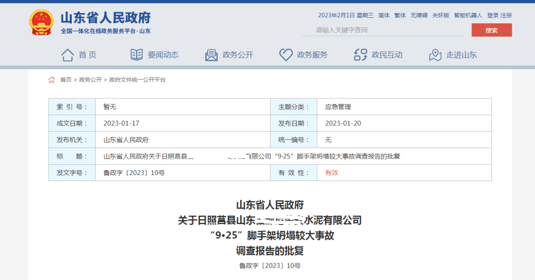 2023年1月,山東省應急管理廳公布該起事故的事故調查報告,山東省人民政府對事故調查報告作出批復,同意事故調查組對事故的原因分析和責任認定。
