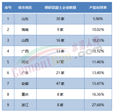 水泥市場(chǎng)的低迷,從下游各地混凝土企業(yè)產(chǎn)能利用率情況也可見(jiàn)其一斑。