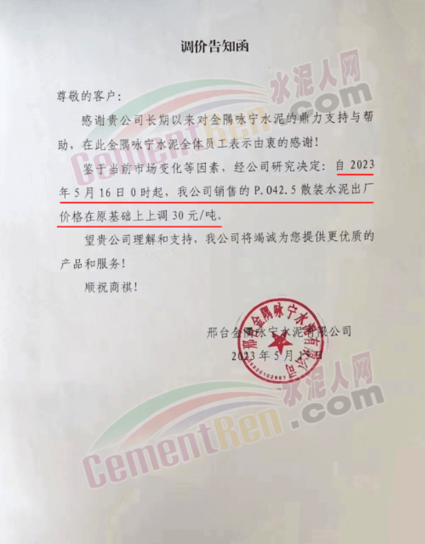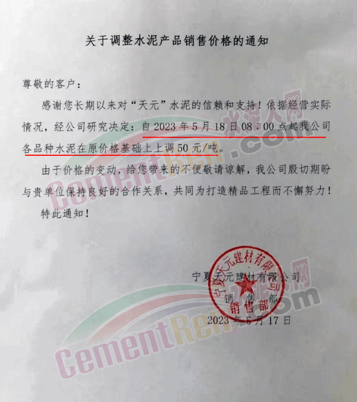 寧夏瀛海天琛建材有限公司通知,根據(jù)公司實際經(jīng)營情況,現(xiàn)決定,自2023年5月17日零點起,各品種水泥在原價格基礎(chǔ)上上調(diào)50元/噸。
