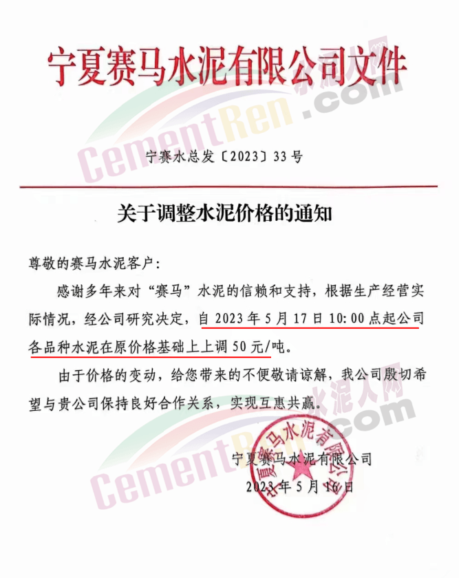 寧夏賽馬水泥有限公司通知,根據(jù)生產(chǎn)經(jīng)營實際情況,經(jīng)公司研究決定,自2023年5月17日10時起公司各品種水泥在原價格基礎(chǔ)上上調(diào)50元/噸。