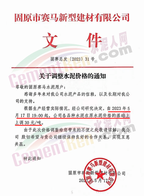 固原市賽馬新型建材有限公司通知根據(jù)生產(chǎn)經(jīng)營實際情況,經(jīng)公司研究決定,自5月17日19時起,公司各品種水泥在原水泥價格的基礎(chǔ)上上調(diào)30元/噸。
