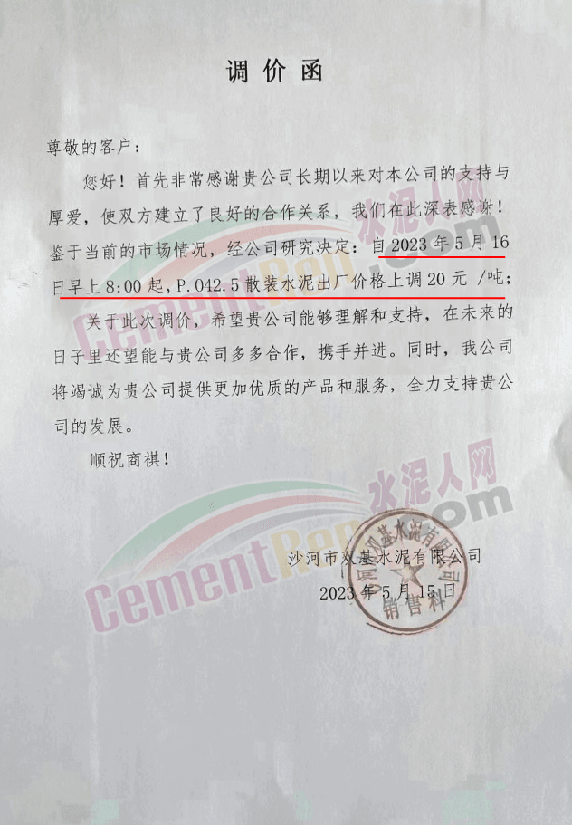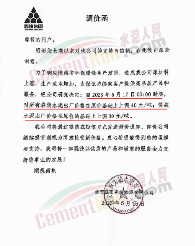 同日,蒲城堯柏特種水泥有限公司通知,為了響應(yīng)夏季錯峰生產(chǎn)政策,造成公司原材料上漲,生產(chǎn)成本增加,為保證持續(xù)向客戶提供高品質(zhì)產(chǎn)品和服務(wù)。經(jīng)公司研究決定:自5月17日0時起,對所有袋裝水泥出廠價格在原價基礎(chǔ)上上調(diào)40元/噸;散裝水泥出廠價格在原價基礎(chǔ)上上調(diào)30元/噸。