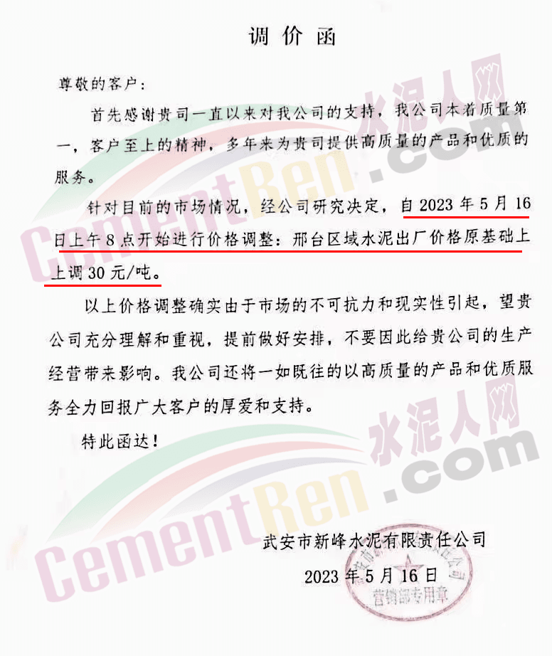 武安市新峰水泥有限責(zé)任公司通知,自5月16日上午8時起邢臺區(qū)域水泥出廠價格上調(diào)30元/噸。