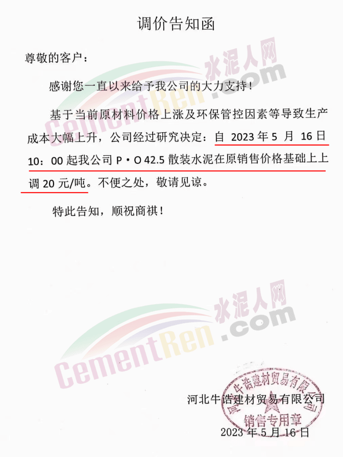 河北牛誥建材貿(mào)易有限公司通知,基于當(dāng)前原材料價格上漲及環(huán)保管控因素等導(dǎo)致生產(chǎn)成本大幅上升,公司經(jīng)過研究決定:自5月16日10時起,P.O42.5散裝水泥上調(diào)20元/噸。