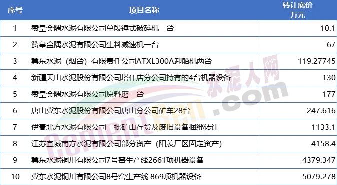 10個正在轉讓的項目多為固定資產和設備機器轉讓。其中冀東水泥銅川有限公司8號窯生產線869項機器設備轉讓底價超5000萬元。