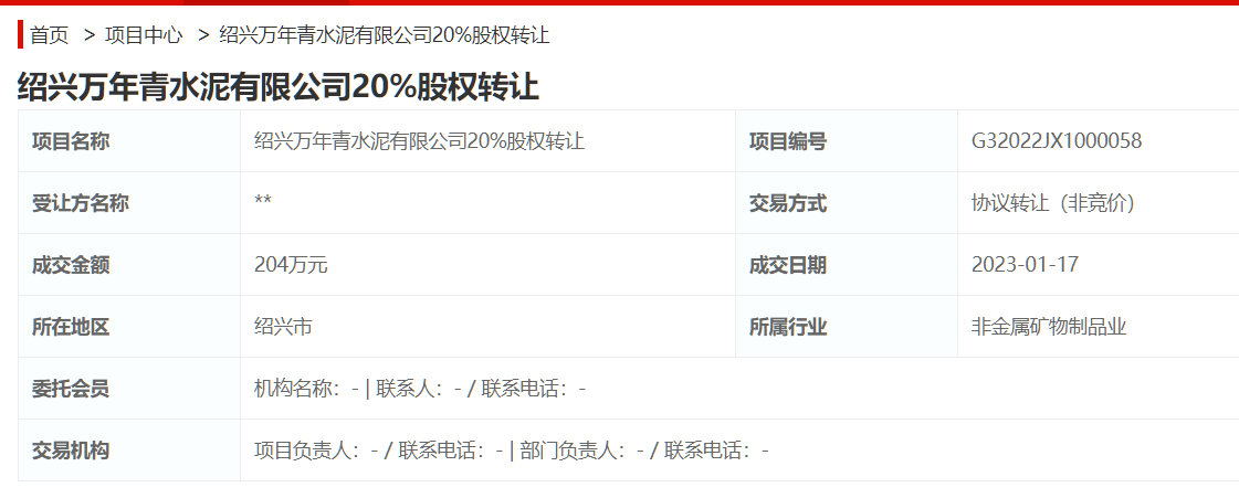 水泥人網注意到紹興萬年青水泥有限公司20%股權轉讓項目是以協(xié)議轉讓(非競價)方式成交,成交金額204萬。