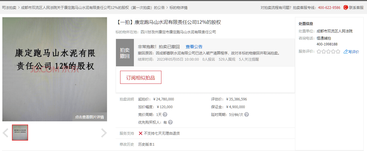同期,康定跑馬山水泥有限責任公司30.5%的股權于5月5日被成功拍出,并未受到成都蓉聯(lián)水泥有限公司破產的影響。成交確認書顯示,經公開競價,競買人成都佰聯(lián)勝機電設備有限公司在京東網拍平臺以最高價競得本拍賣標的,拍賣成交價為6296萬元。