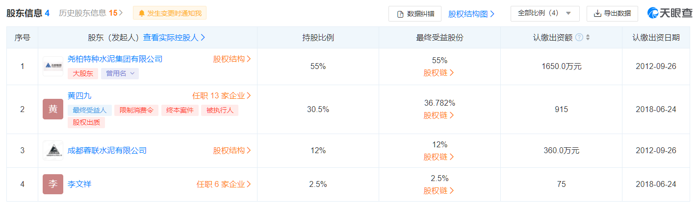成都蓉聯(lián)水泥有限公司為何能影響康定跑馬山水泥有限責任公司的股權出售呢?從企業(yè)股權結構可見,康定跑馬山水泥有限責任公司由堯柏特種水泥持股55%,黃四九持股30.5%,成都蓉聯(lián)水泥有限公司持股12%,李文祥持股2.5%。