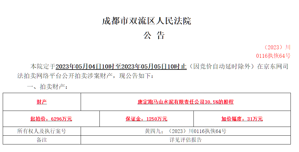 3月29日,成都市雙流區(qū)人民法院發(fā)布拍賣公告(川0116執(zhí)恢64號)提到定于5月4日10時至5月5日10時在京東網司法拍賣網絡平臺公開拍賣涉案財產。拍賣財產為康定跑馬山水泥有限責任公司12%的股權,起拍價2478萬元。
