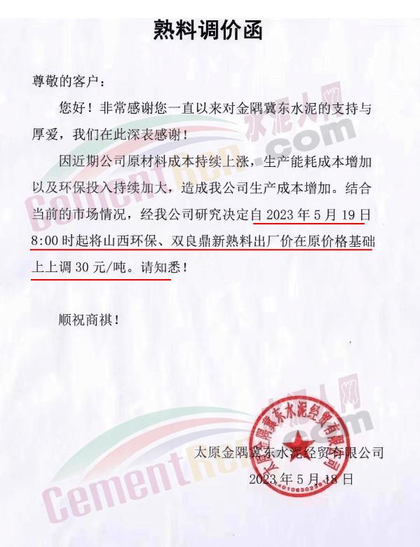 太原金隅冀東水泥經(jīng)貿(mào)有限公司通知,因近期公司原材料成本持續(xù)上漲,生產(chǎn)能耗成本增加以及環(huán)保投入持續(xù)加大,造成公司生產(chǎn)成本增加。結(jié)合當(dāng)前的市場情況,經(jīng)公司研究決定自5月19日8時(shí)起將山西環(huán)保、雙良鼎新熟料出廠價(jià)在原價(jià)格基礎(chǔ)上上調(diào)30元/噸。