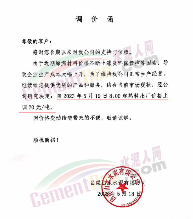 呂梁山水水泥有限公司通知,由于近期原燃材料價(jià)格不斷上漲及環(huán)保管控等因素,導(dǎo)致企業(yè)生產(chǎn)成本大幅上升,為了維持公司正常生產(chǎn)經(jīng)營繼續(xù)給客戶提供優(yōu)質(zhì)的產(chǎn)品和服務(wù),結(jié)合當(dāng)前市場現(xiàn)狀,經(jīng)公司研究決定,自5月19日8時(shí)起熟料出廠價(jià)格上調(diào)20元/噸。