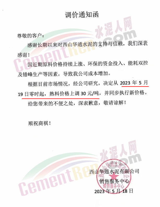 西山華通水泥有限公司通知因近期原料價(jià)格持續(xù)上漲、環(huán)保的資金投入、能耗雙控及錯(cuò)峰生產(chǎn)等因素,導(dǎo)致公司成本增加。根據(jù)目前市場情況,經(jīng)公司研究,決定從年5月19日零時(shí)起熟料價(jià)格上調(diào)30元/噸。