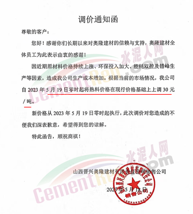 山西晉興奧隆建材有限責(zé)任公司銷售公司通知,因近期原材料價(jià)格持續(xù)上漲、環(huán)保投入加大、能耗雙控及錯(cuò)峰生產(chǎn)等因素,造成公司生產(chǎn)成本增加。根據(jù)當(dāng)前的市場情況,公司自2023年5月19日零時(shí)起將熟料價(jià)格在現(xiàn)行價(jià)格基礎(chǔ)上上調(diào)30元/噸。