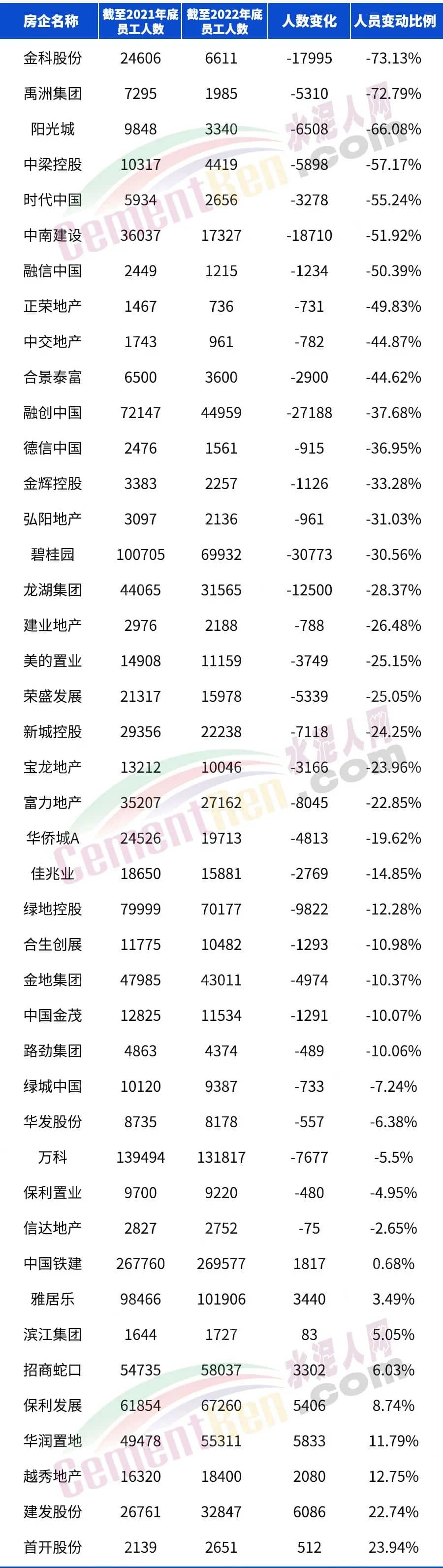 據(jù)不完全統(tǒng)計,TOP50房企中有34家房企2022年員工減少,減員總規(guī)模接近20萬人。人員減少最多的是碧桂園,減員數(shù)量超過3萬人,而減員幅度最大的則是金科股份,一年內(nèi)裁掉了73.13%的員工。