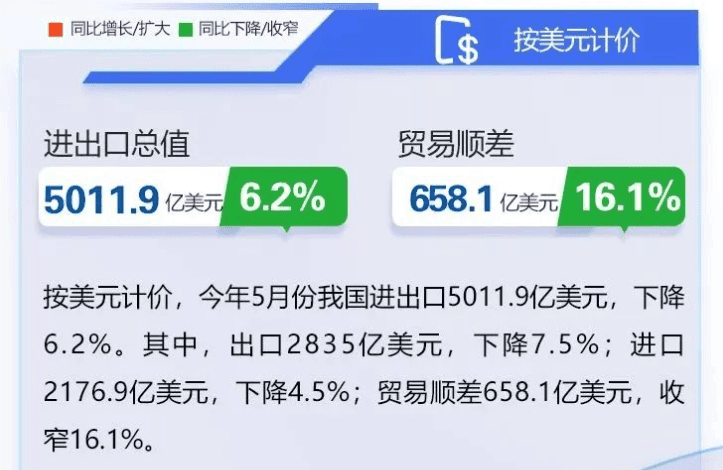 事實上,光伏行業(yè)的出口受到壓制只是近期國內(nèi)外貿(mào)行業(yè)的一個縮影,多方的制裁和約束,也讓國內(nèi)的外貿(mào)企業(yè)走入更深的困境。據(jù)海關(guān)統(tǒng)計,今年5月份,我國進出口3.45萬億元,增長0.5%。其中,出口1.95萬億元,下降0.8%;按美元計價,今年5月份我國進出口5011.9億美元,下降6.2%。其中,出口2835億美元,下降7.5%。貿(mào)易順差658.1億美元,收窄16.1%。