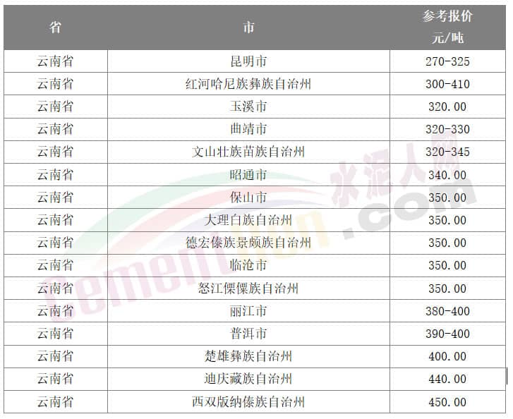 據(jù)水泥人網(wǎng)了解,或因云南省內(nèi)各區(qū)域錯峰生產(chǎn)執(zhí)行力度不同,各區(qū)域水泥差價較大,低價水泥對多地市場都有沖擊。水泥人網(wǎng)信息中心監(jiān)控?cái)?shù)據(jù)顯示,目前云南省內(nèi)參考報(bào)價在270-450元/噸,昆明區(qū)域P.O42.5散裝水泥報(bào)價在270-325元/噸不等,不同企業(yè)最大差價在55元/噸左右。