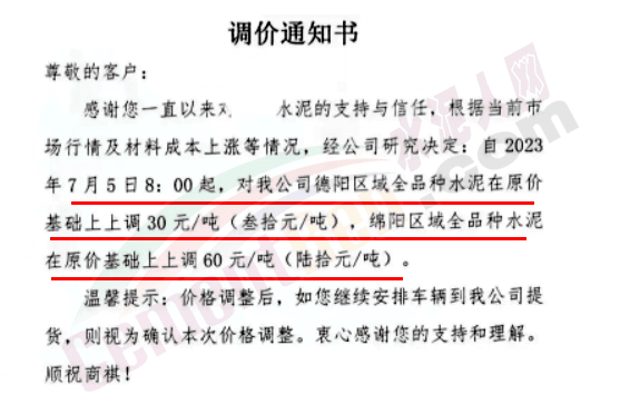 “天涯‘牌水泥通知,自2023年7月8日零時起所有品種水泥在出廠價格基礎(chǔ)上上調(diào)30元/噸,同期調(diào)整粉煤灰及礦渣粉報(bào)價。