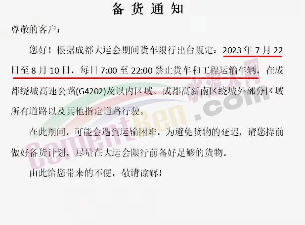 水泥人網(wǎng)注意到,由于成都大運會的原因,經(jīng)銷商在附件中除了調(diào)價通知外還有一份備貨通知。備貨通知中提到。7月22日至8月10日期間每天7時至22時禁止貨車和工程運輸車輛在成都繞城高速及以內(nèi)區(qū)域、成都高新南區(qū)繞城外部分區(qū)域所在道路以及其他指定道路行駛。在此期間可能會遇到運輸困難,為避免貨物的延遲,請客戶提前做好備貨計劃,盡量在限行前備好足夠貨物。