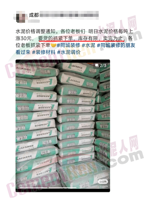 另有成都經(jīng)銷商通知:每噸漲30元,每包漲約1.5元,要貨的抓緊下單,庫存有限,賣完為止……