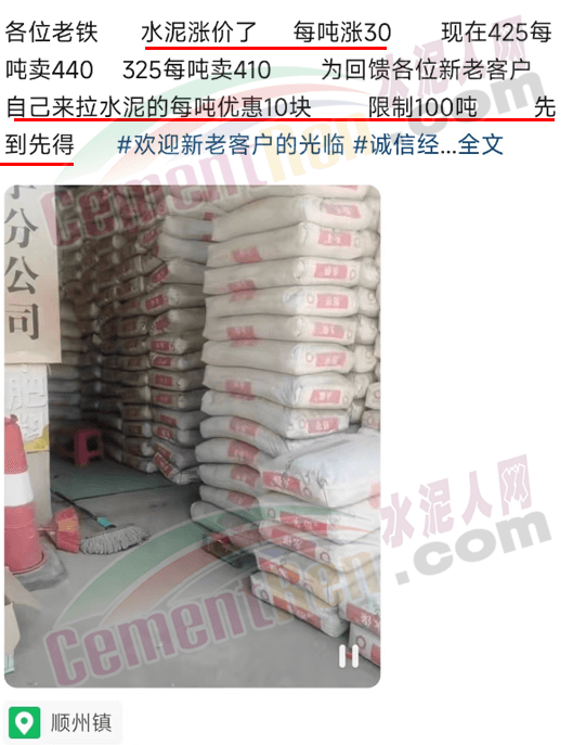 同期,云南省麗江市永勝縣順州鎮(zhèn)一經(jīng)銷商發(fā)通知稱,水泥每噸漲30元,42.5報價440元/噸,32.5報價410元/噸,為回饋客戶,自己來拉水泥優(yōu)惠10元/噸,限量100噸,先到先得。