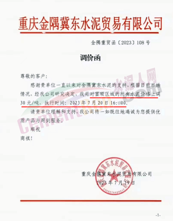 近日重慶金隅冀東水泥貿(mào)易有限公司根據(jù)目前市場情況,經(jīng)公司研究決定,對隆昌、富順區(qū)域的所有水泥價格上調(diào)30元/噸,執(zhí)行時間分別為2023年7月21日12時和16時。