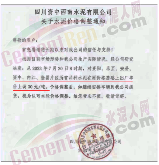 四川資中西南水泥通知,從2023年7月20日8時起,對資陽、樂至、安岳、資中、內(nèi)江、隆昌片區(qū)所有品種水泥在原價格基礎(chǔ)上出廠單價上調(diào) 30元/噸。