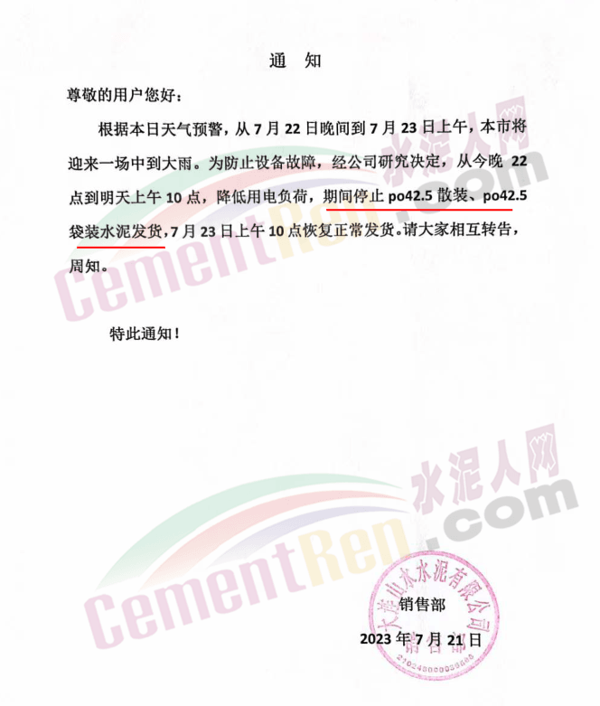 日前大連山水水泥又通知,根據(jù)天氣預(yù)警,從7月22日晚間到7月23日上午,大連市將迎來一場中到大雨。為防止設(shè)備故障,經(jīng)公司研究決定,從當(dāng)晚22點到次日上午10點,降低用電負(fù)荷,期間停止P.O42.5散裝和P.O425袋裝水泥發(fā)貨。