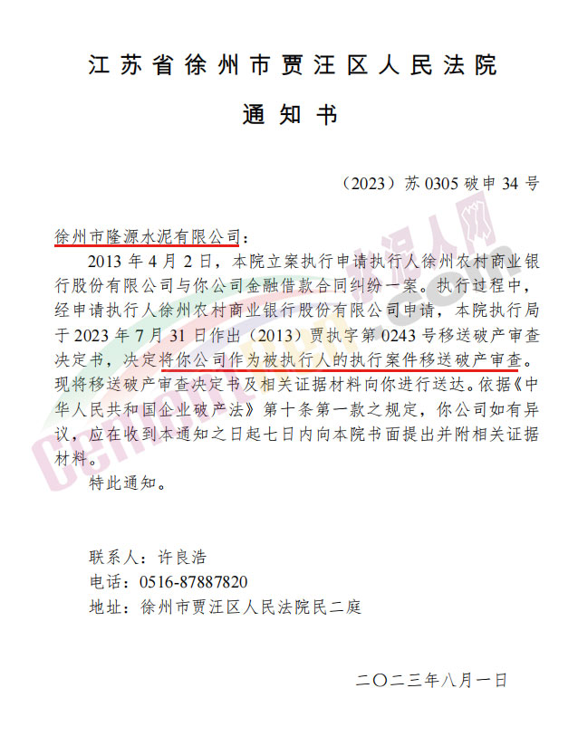 法院執(zhí)行局于2023年7月31日作出(2013)賈執(zhí)字第0243號移送破產審查決定書,決定將徐州市隆源水泥有限公司作為被執(zhí)行人的執(zhí)行案件移送破產審查。