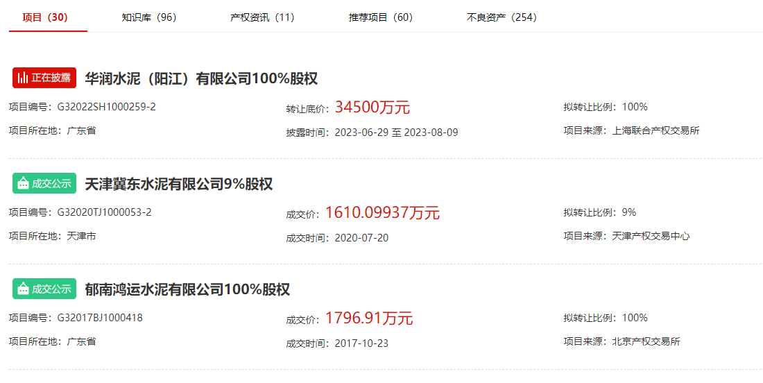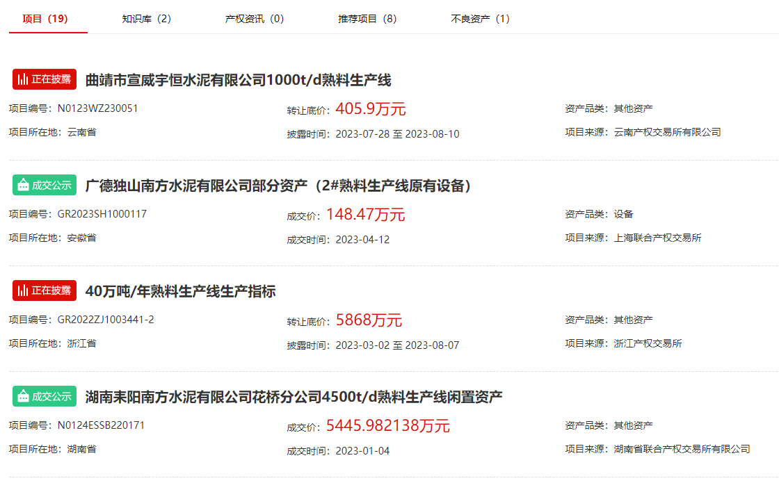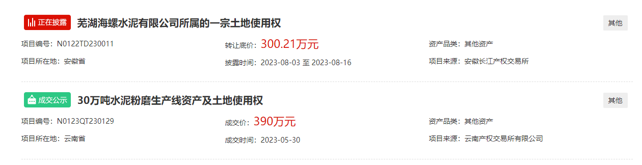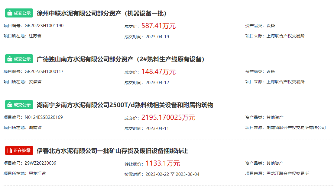 另有包含華潤水泥、冀東水泥、萬年青水泥在內的4家品牌企業(yè)公開出讓企業(yè)股權;包含行業(yè)知名企業(yè)蕪湖海螺水泥在內的兩家企業(yè)公開出讓土地使用權;包含天山水泥、中聯(lián)水泥、南方水泥、北方水泥、冀東水泥在內的14家企業(yè)公開出讓熟料生產線、熟料指標、房屋建筑物、構筑物及機器設備等資產。
