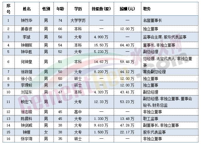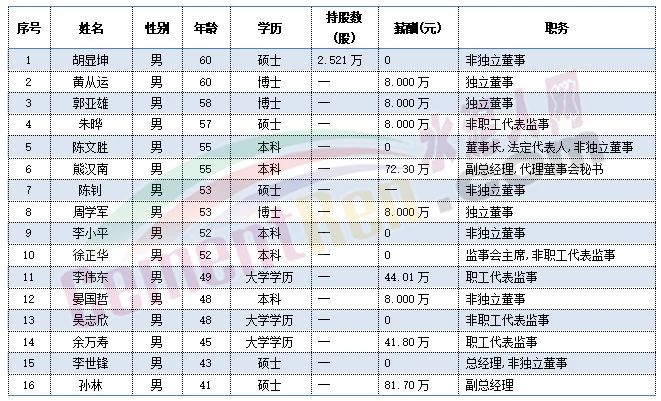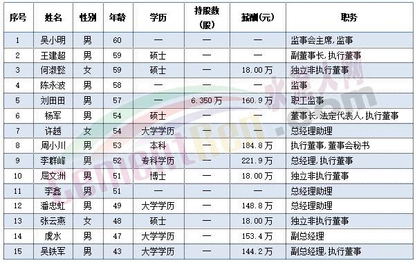 尖峰集團(tuán)職工代表秦旭平、戴錦孝今年60歲,董事長蔣曉萌、副總經(jīng)理項(xiàng)崇平、獨(dú)立董事楊大龍今年59歲,副總經(jīng)理黃金龍今年58歲。