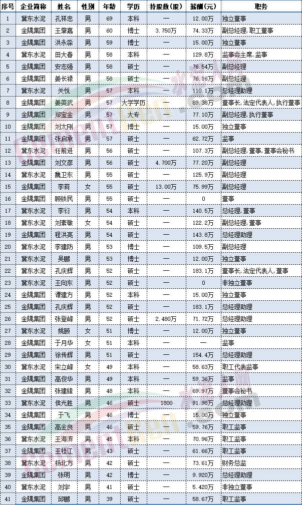 金隅冀東高管中,金隅集團(tuán)副總經(jīng)理王肇嘉、獨(dú)立董事洪永淼年齡在59-60歲之間。