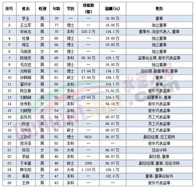 祁連山董事長脫利成今年60歲,總裁劉繼彬、副總裁王學(xué)政今年59歲,副總裁劉開祿今年58歲。