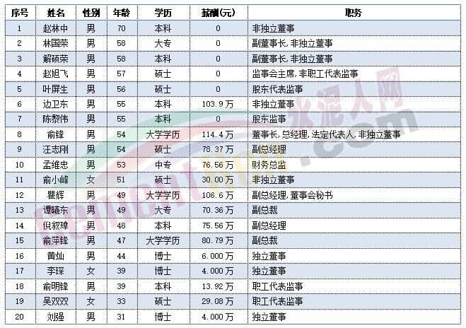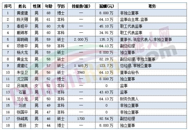 福建水泥獨(dú)立董事肖陽今年60歲,總經(jīng)理華萬征,副總經(jīng)理李小明,董事會秘書林金水以及監(jiān)事會主席彭家清今年都是57歲。