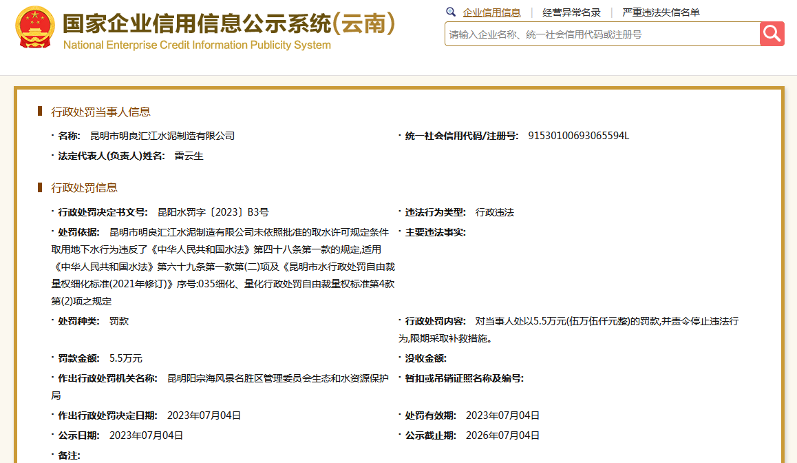 另外,根據(jù)國家企業(yè)信用信息公示系統(tǒng)公開信息顯示,昆明市明良匯江水泥制造有限公司未依照批準的取水許可規(guī)定條件取用地下水,被昆明陽宗海風景名勝區(qū)管理委員會生態(tài)和水資源保護局處罰。