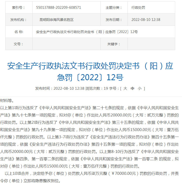2022年8月10日,昆明陽宗海風景名勝區(qū)管理委員會發(fā)布《安全生產(chǎn)行政執(zhí)法文書行政處罰決定書(陽)應急罰〔2022〕12號》稱:昆明市明良匯江水泥制造有限公司大馬山石灰?guī)r礦在生產(chǎn)過程中存在未配備注冊安全工程師、采礦技術(shù)員,礦山+1980m水平臺階存在凹陷,該區(qū)域未設置警示標識,礦山未編制挖掘機、裝載機、推土機操作規(guī)程等違法違規(guī)行為,昆明陽宗海風景名勝區(qū)管理委員會對該水泥廠作出7萬元處罰。