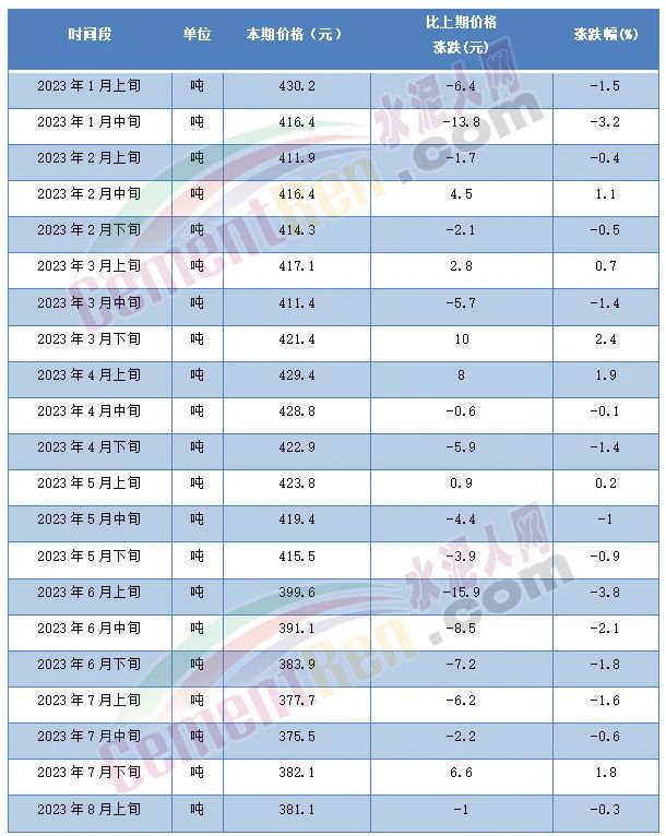 8月14日,國家統(tǒng)計(jì)局發(fā)布的2023年8月上旬流通領(lǐng)域重要生產(chǎn)資料市場(chǎng)價(jià)格變動(dòng)情況顯示,普通硅酸鹽水泥(P.O42.5散裝)水泥報(bào)價(jià)311.7元/噸,且為自5月上旬以來第10次突破年內(nèi)最低價(jià)。