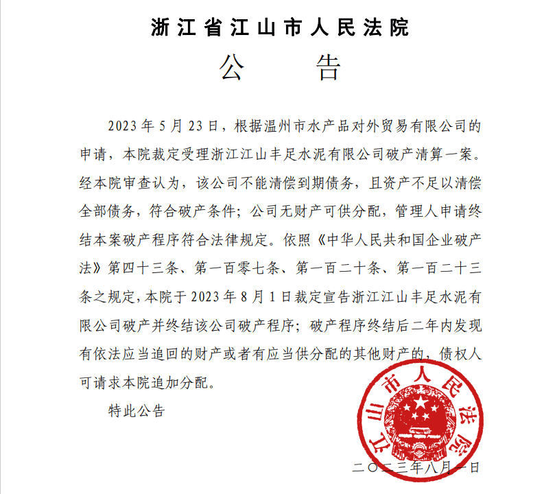 8月2日,浙江省江山市人民法院公告,經(jīng)本院審查認(rèn)為,浙江江山豐足水泥有限公司不能清償?shù)狡趥鶆?wù),且資產(chǎn)不足以清償全部債務(wù),符合破產(chǎn)條件;公司無財(cái)產(chǎn)可供分配,管理人申請(qǐng)終結(jié)本案破產(chǎn)程序符合法律規(guī)定,本院裁定宣告浙江江山豐足水泥有限公司破產(chǎn)并終結(jié)該公司破產(chǎn)程序。