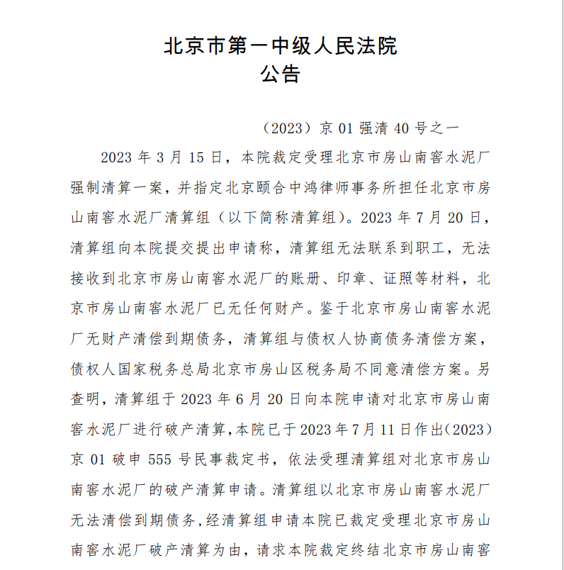 7月21日,北京市第一中級(jí)人民法院公告,本院于 2023 年7月21日確認(rèn)北京市房山南窖水泥廠清算報(bào)告并裁定終結(jié)北京市房山南窖水泥廠強(qiáng)制清算程序。