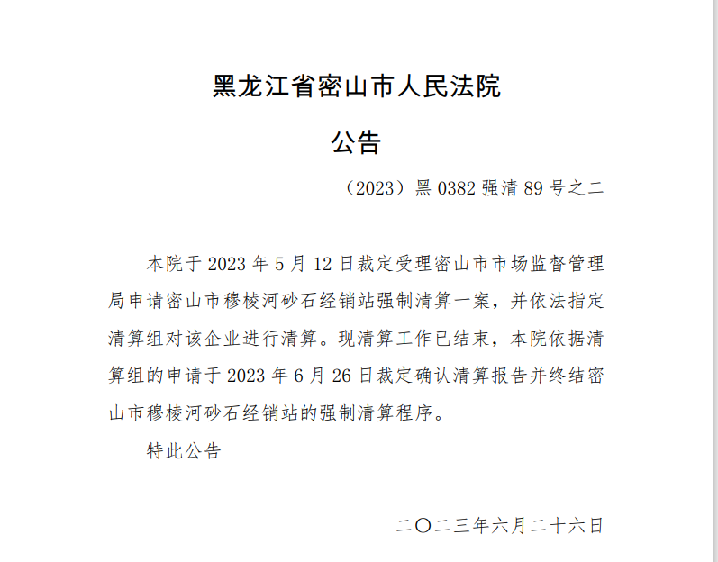 6月26日,黑龍江省密山市人民法院公告,本院于2023年5月12日裁定受理密山市市場(chǎng)監(jiān)督管理局申請(qǐng)密山市穆棱河砂石經(jīng)銷站強(qiáng)制清算一案,并依法指定清算組對(duì)該企業(yè)進(jìn)行清算?,F(xiàn)清算工作已結(jié)束,本院依據(jù)清算組的申請(qǐng)于 2023年6月26日裁定確認(rèn)清算報(bào)告并終結(jié)密山市穆棱河砂石經(jīng)銷站的強(qiáng)制清算程序。