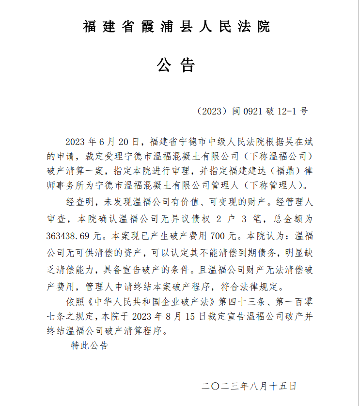 8月15日,福建省霞浦縣人民法院公告,寧德市溫?;炷劣邢薰緹o可供清償?shù)馁Y產(chǎn),可以認(rèn)定其不能清償?shù)狡趥鶆?wù),明顯缺乏清償能力,具備宣告破產(chǎn)的條件。且溫福公司財(cái)產(chǎn)無法清償破產(chǎn)費(fèi)用,管理人申請(qǐng)終結(jié)本案破產(chǎn)程序,符合法律規(guī)定。本院于 2023 年 8 月 15 日裁定宣告溫福公司破產(chǎn)并終結(jié)溫福公司破產(chǎn)清算程序。
