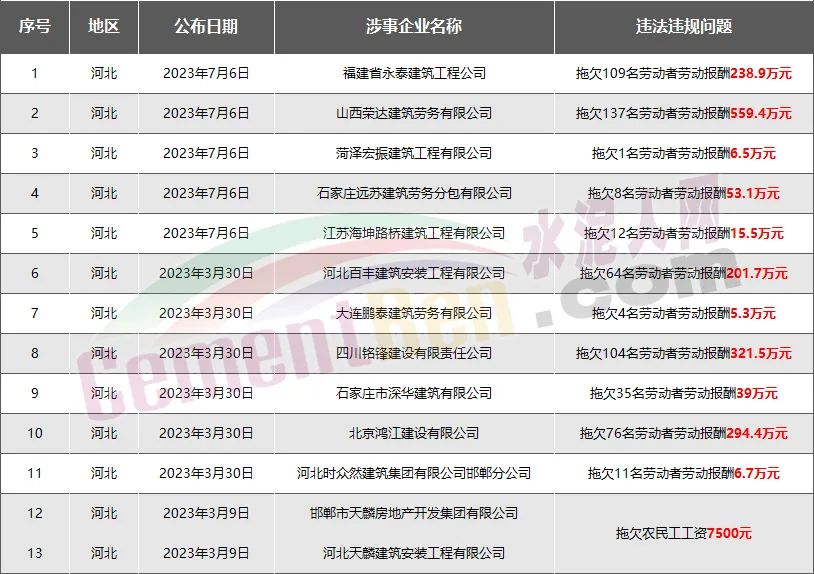 河北省13家房企、建企欠薪被通報(bào)或處罰,涉及金額1742萬(wàn)元